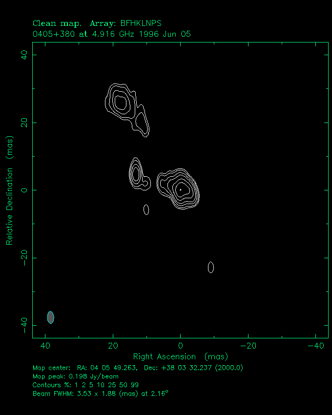 | 0402+379 | 4 h 5 m 49.2634 s | + 38 ° 3 ´ 32.237 " | 0.9 Jy | galaxy | 0.055 |