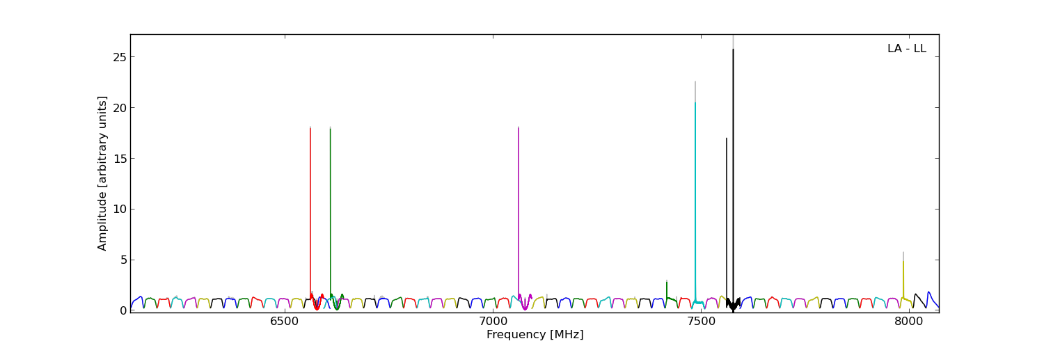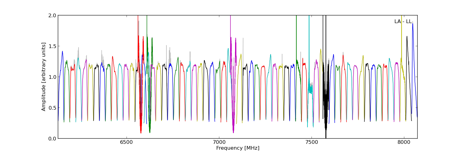 Total power spectrum in arbitrary units. The solid lines indicate the mean value and the shaded area the peaks.