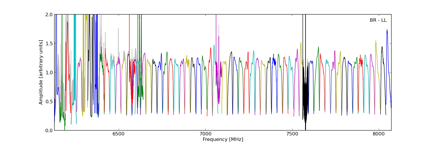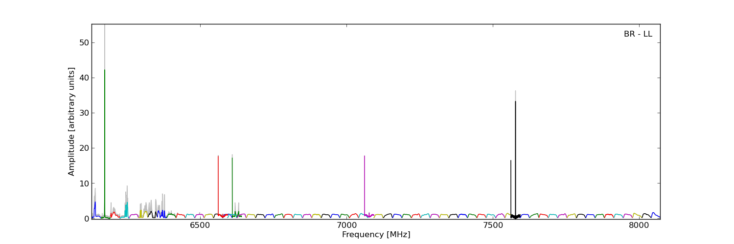 Total power spectrum in arbitrary units. The solid lines indicate the mean value and the shaded area the peaks.
