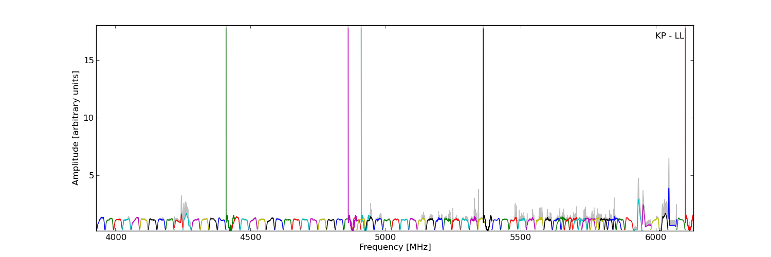 Total power spectrum in arbitrary units. The solid lines indicate the mean value and the shaded area the peaks.