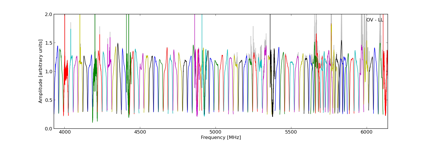 Total power spectrum in arbitrary units. The solid lines indicate the mean value and the shaded area the peaks.