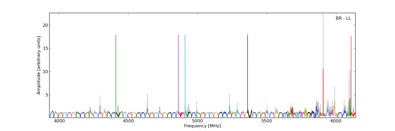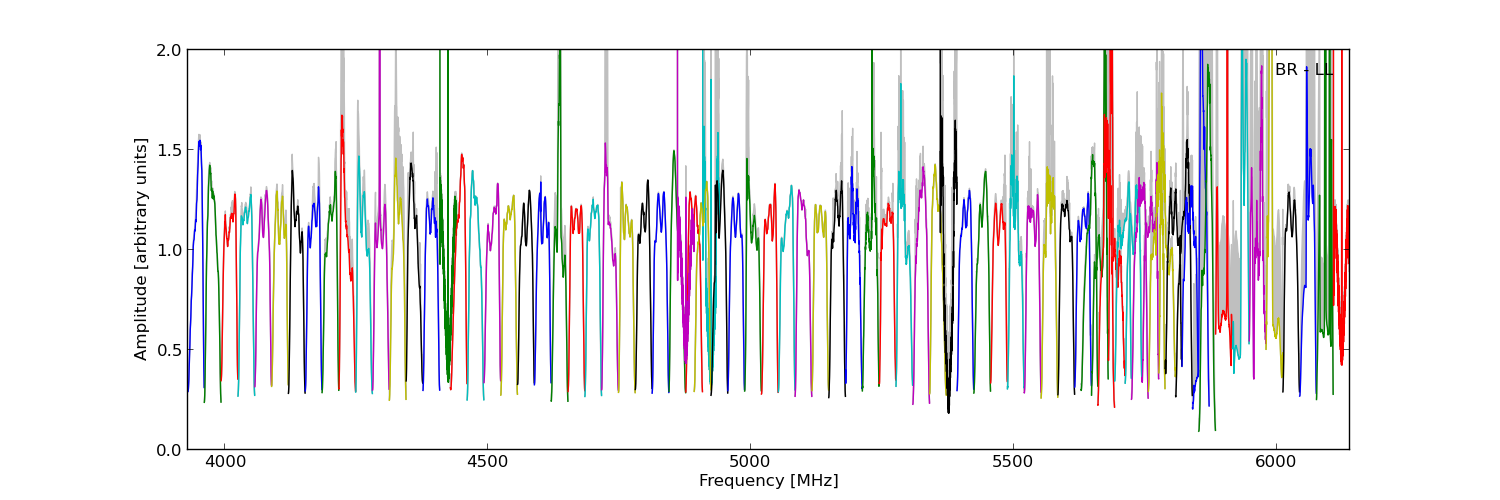 Total power spectrum in arbitrary units. The solid lines indicate the mean value and the shaded area the peaks.