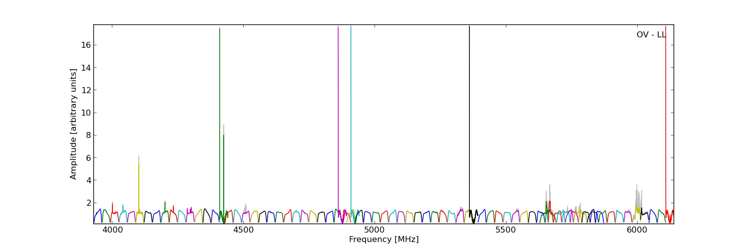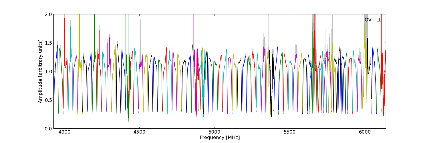 Total power spectrum in arbitrary units. The solid lines indicate the mean value and the shaded area the peaks.