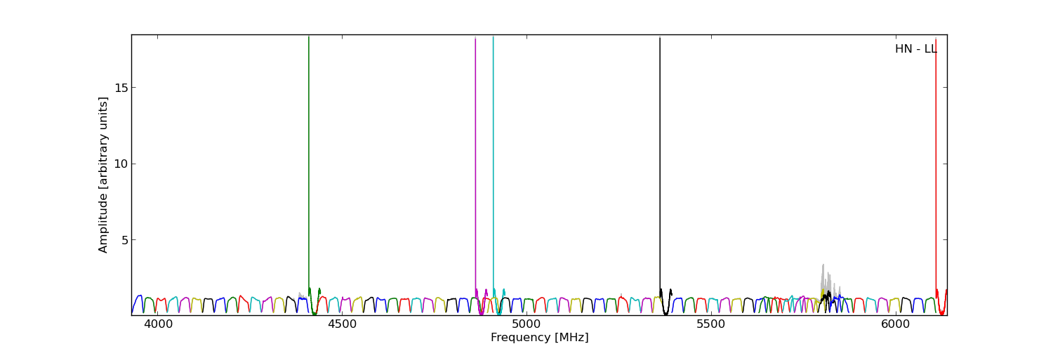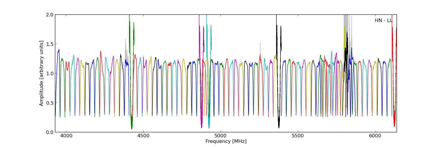 Total power spectrum in arbitrary units. The solid lines indicate the mean value and the shaded area the peaks.