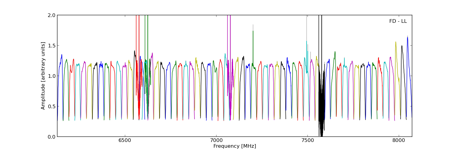 Total power spectrum in arbitrary units. The solid lines indicate the mean value and the shaded area the peaks.