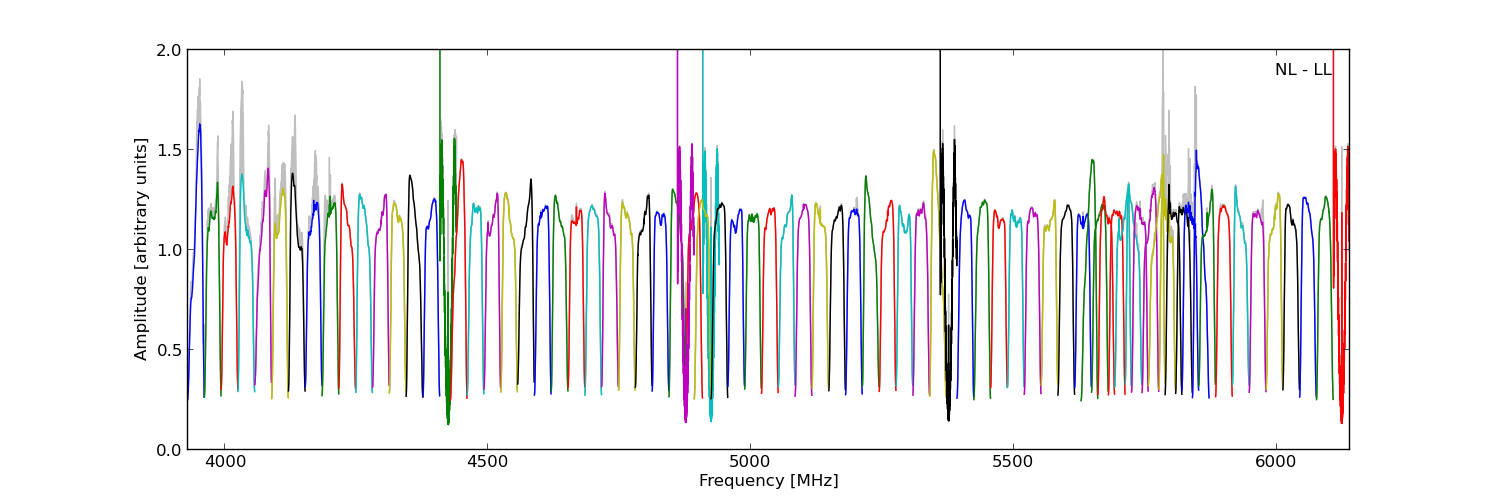 Total power spectrum in arbitrary units. The solid lines indicate the mean value and the shaded area the peaks.