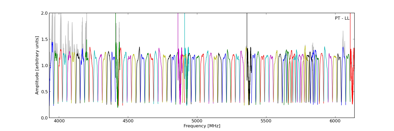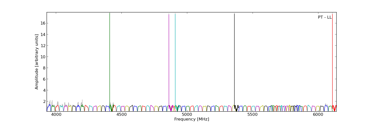 Total power spectrum in arbitrary units. The solid lines indicate the mean value and the shaded area the peaks.