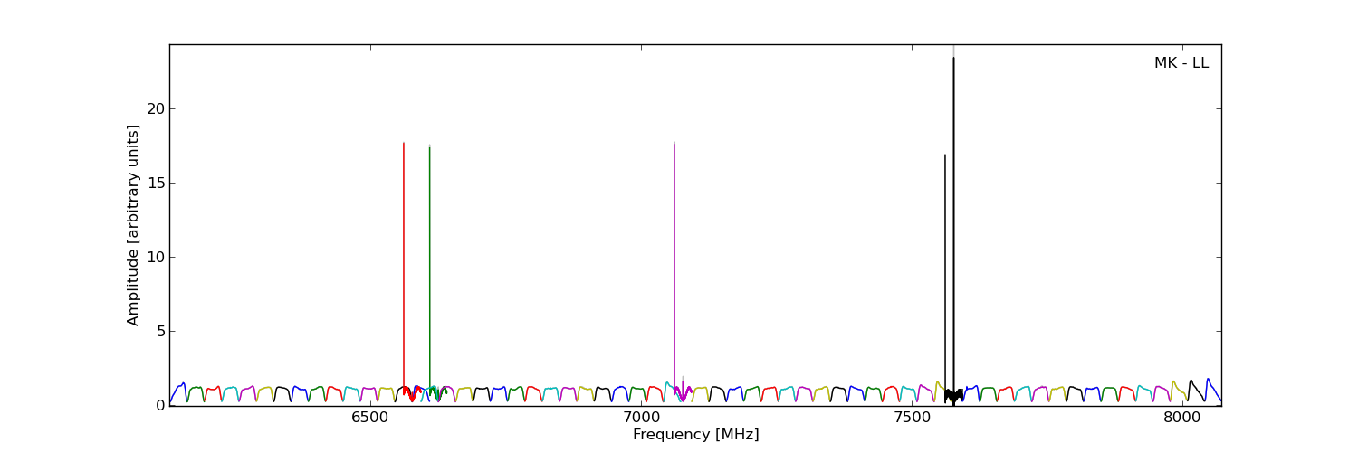 Total power spectrum in arbitrary units. The solid lines indicate the mean value and the shaded area the peaks.