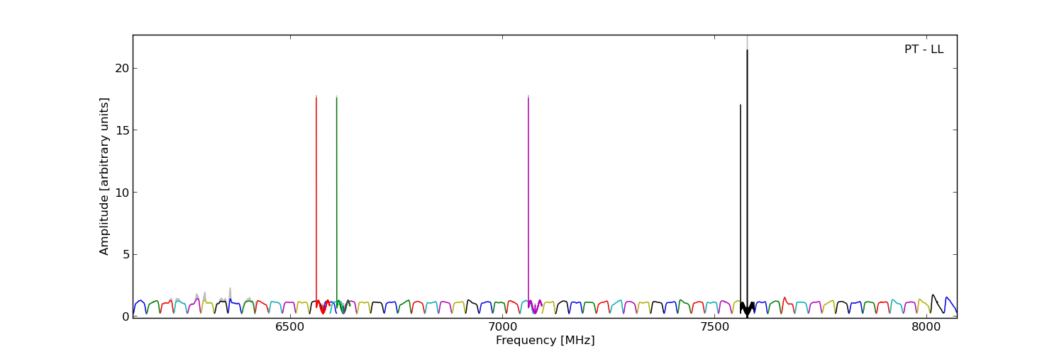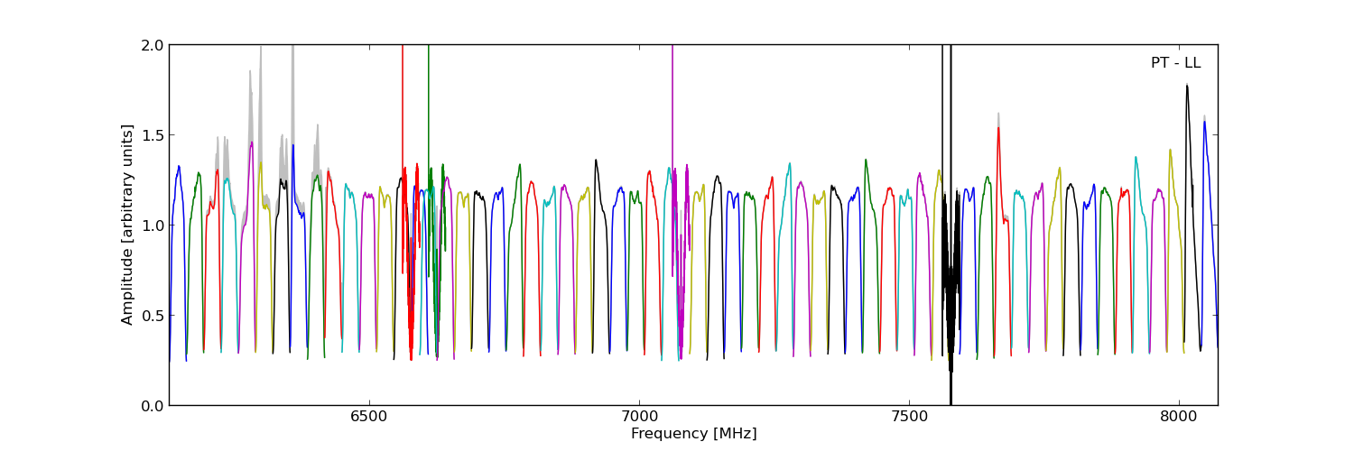 Total power spectrum in arbitrary units. The solid lines indicate the mean value and the shaded area the peaks.