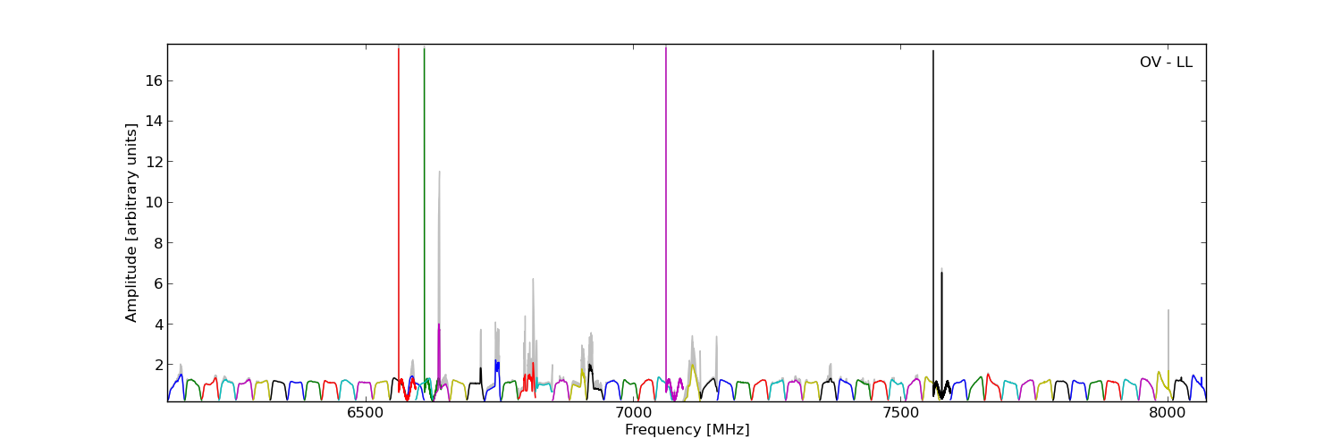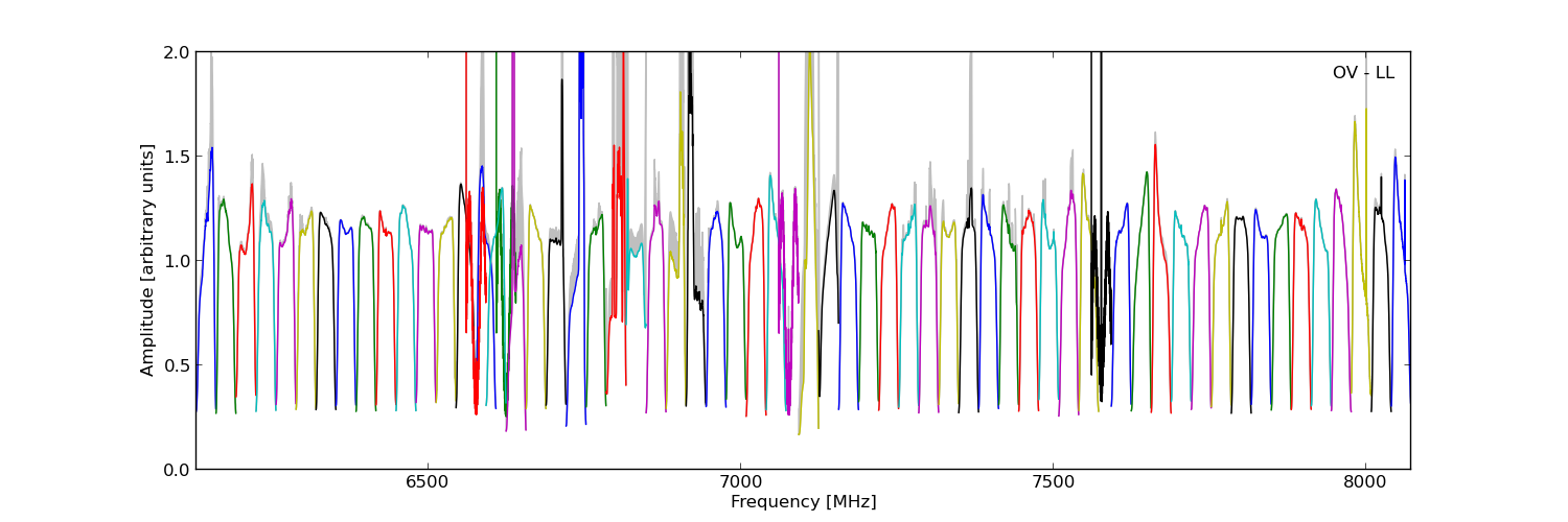 Total power spectrum in arbitrary units. The solid lines indicate the mean value and the shaded area the peaks.