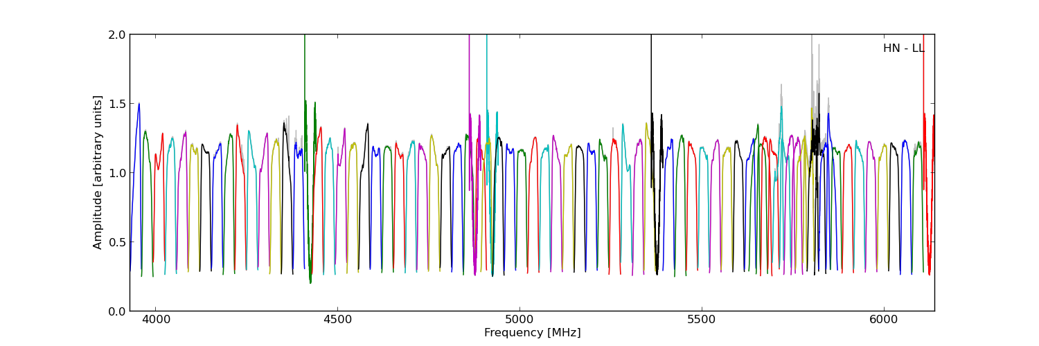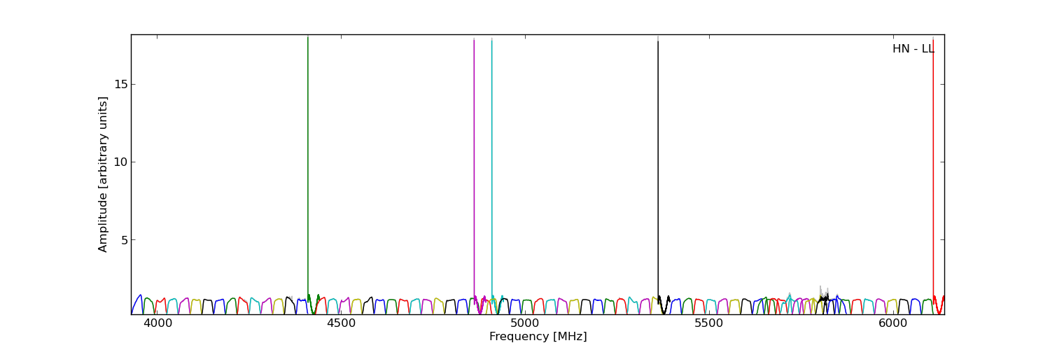 Total power spectrum in arbitrary units. The solid lines indicate the mean value and the shaded area the peaks.