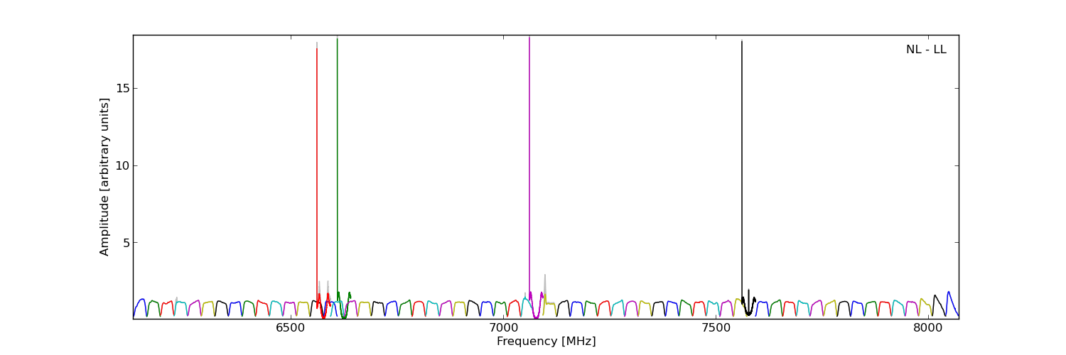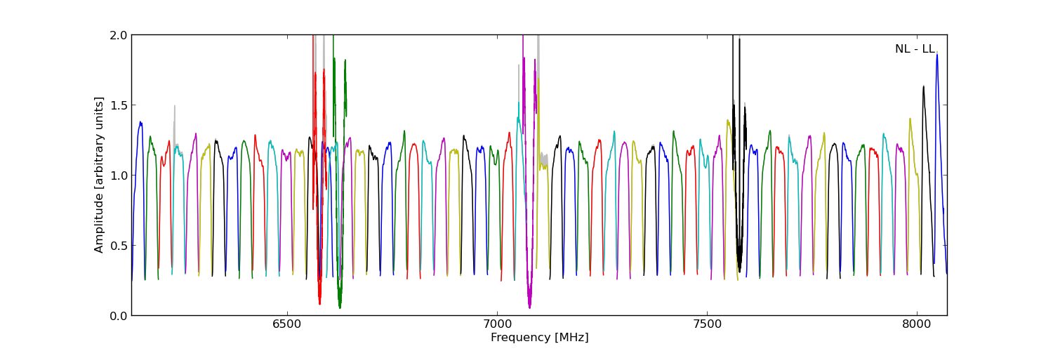 Total power spectrum in arbitrary units. The solid lines indicate the mean value and the shaded area the peaks.