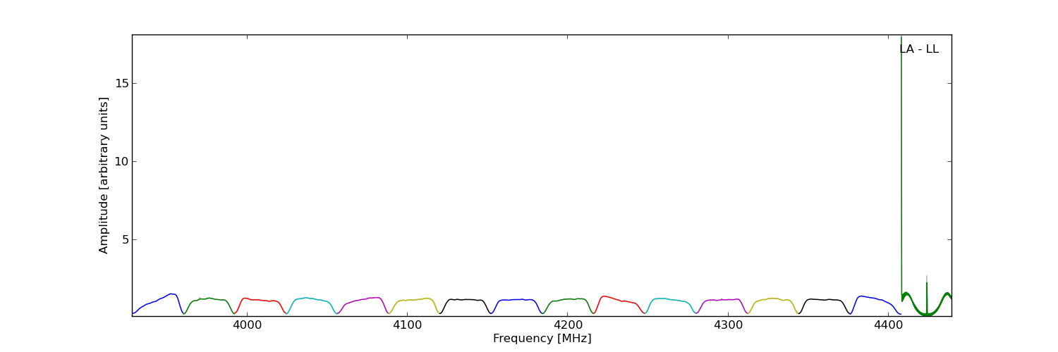 Total power spectrum in arbitrary units. The solid lines indicate the mean value and the shaded area the peaks.