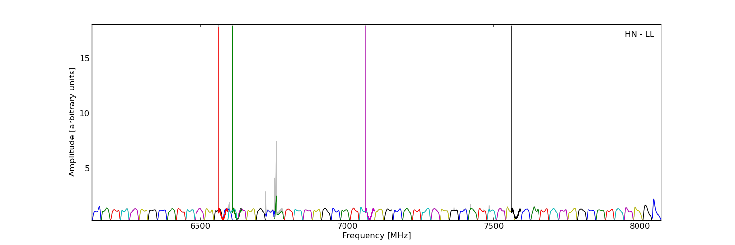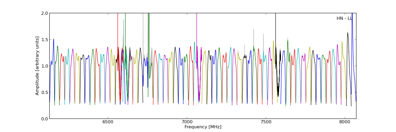 Total power spectrum in arbitrary units. The solid lines indicate the mean value and the shaded area the peaks.