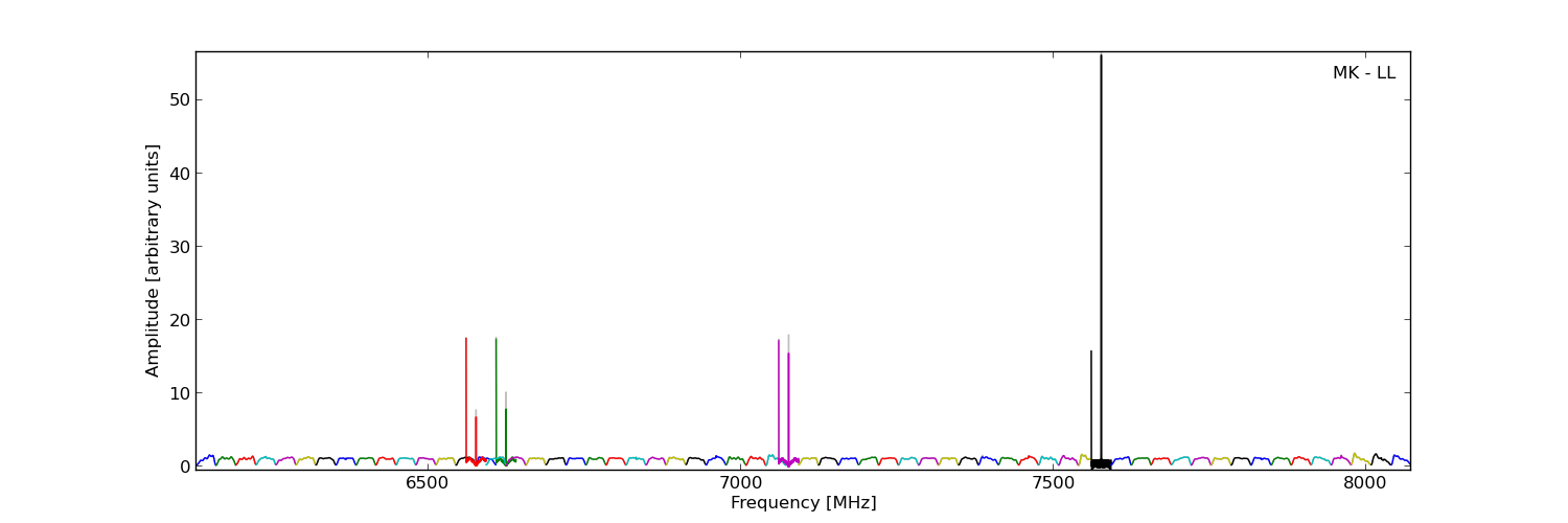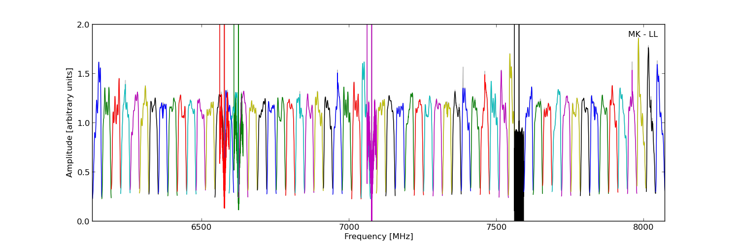 Total power spectrum in arbitrary units. The solid lines indicate the mean value and the shaded area the peaks.