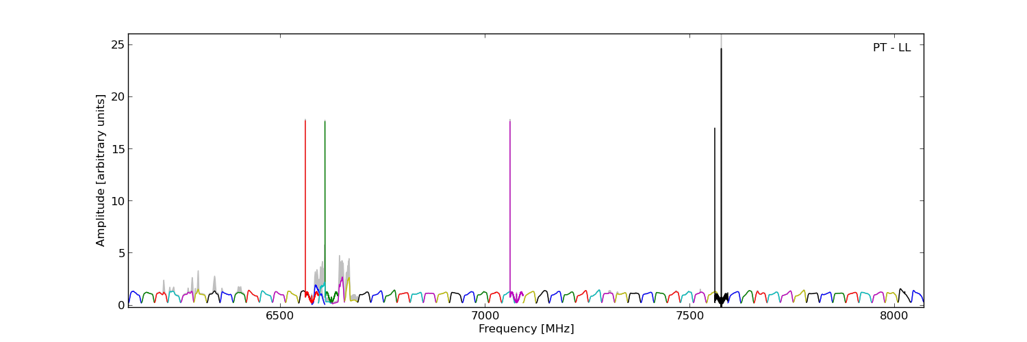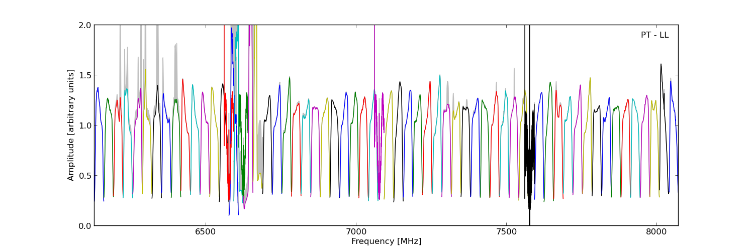 Total power spectrum in arbitrary units. The solid lines indicate the mean value and the shaded area the peaks.