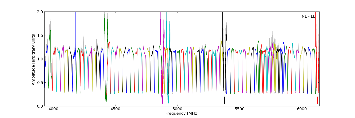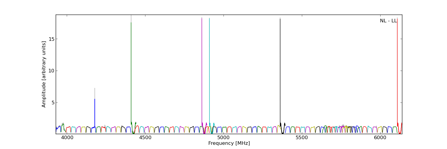Total power spectrum in arbitrary units. The solid lines indicate the mean value and the shaded area the peaks.