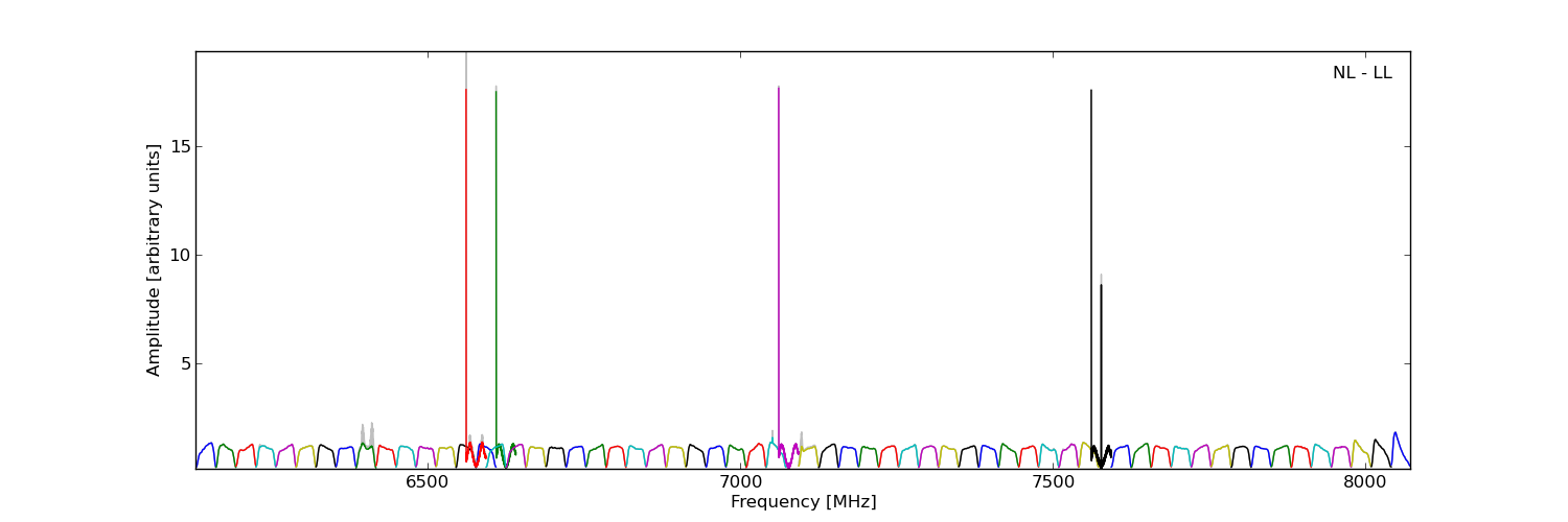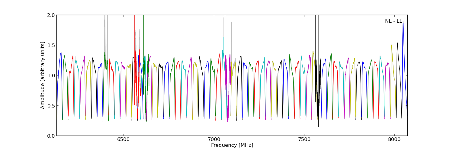 Total power spectrum in arbitrary units. The solid lines indicate the mean value and the shaded area the peaks.