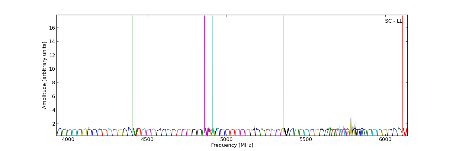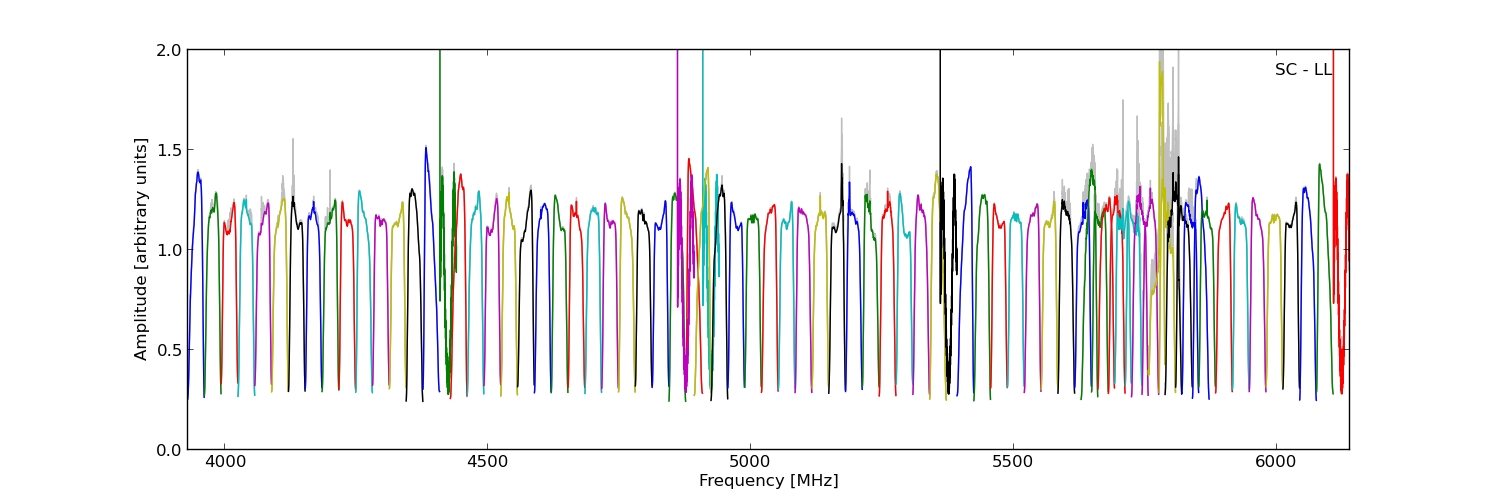 Total power spectrum in arbitrary units. The solid lines indicate the mean value and the shaded area the peaks.