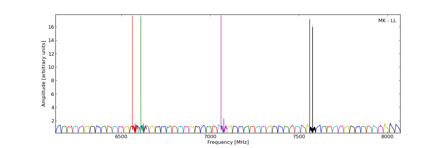 Total power spectrum in arbitrary units. The solid lines indicate the mean value and the shaded area the peaks.