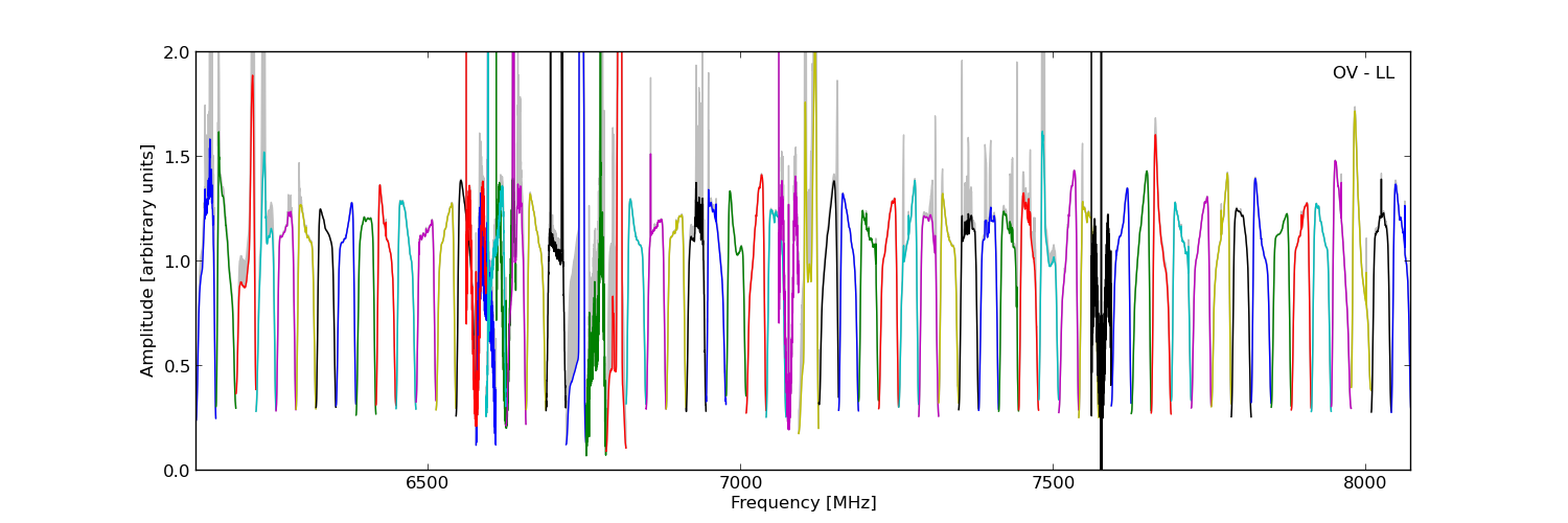 Total power spectrum in arbitrary units. The solid lines indicate the mean value and the shaded area the peaks.