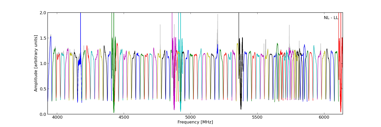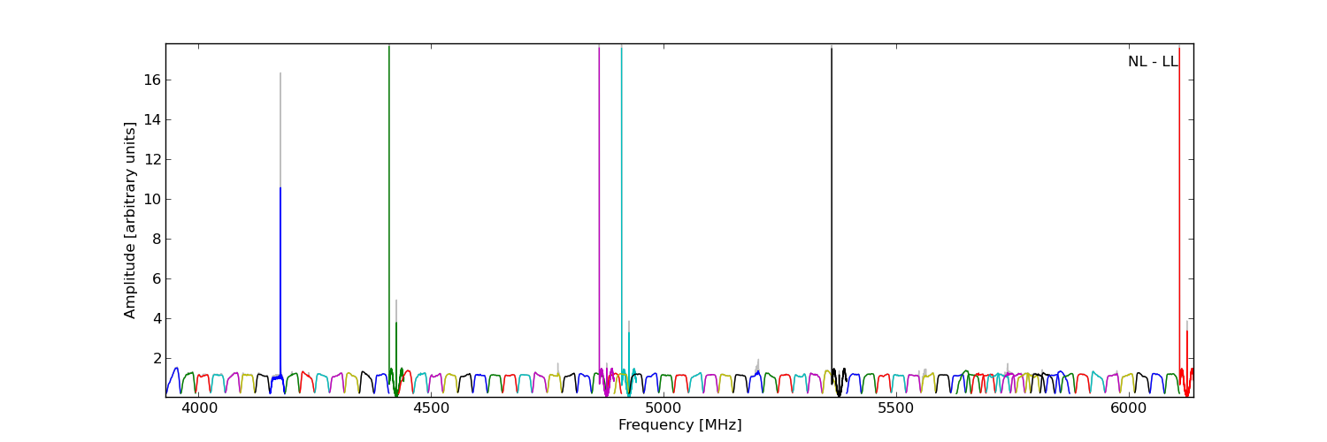 Total power spectrum in arbitrary units. The solid lines indicate the mean value and the shaded area the peaks.