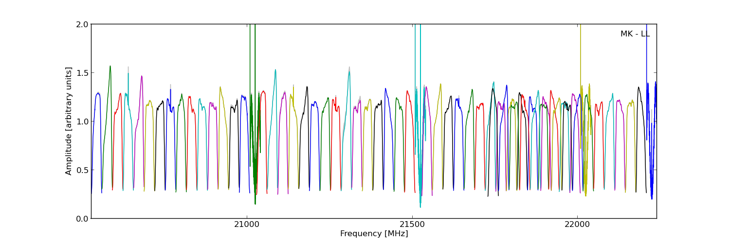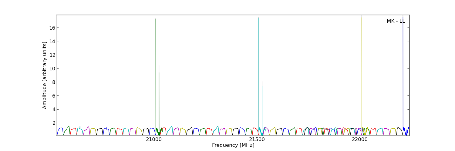 Total power spectrum in arbitrary units. The solid lines indicate the mean value and the shaded area the peaks.