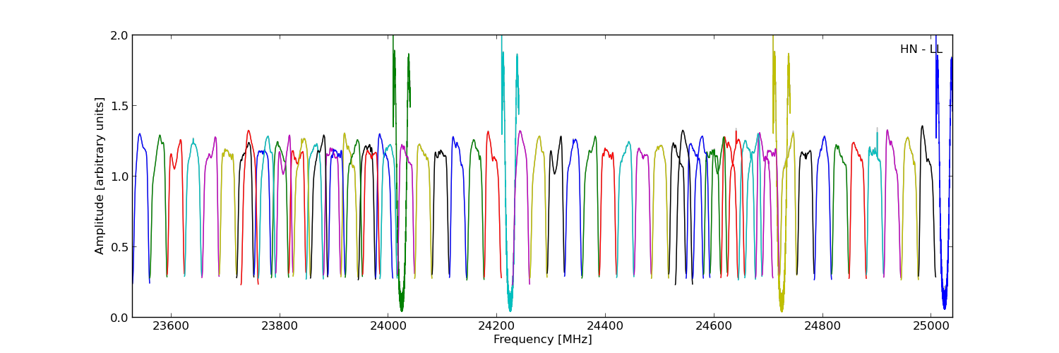 Total power spectrum in arbitrary units. The solid lines indicate the mean value and the shaded area the peaks.
