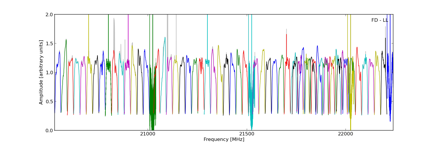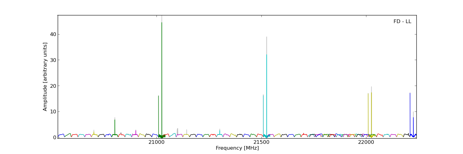 Total power spectrum in arbitrary units. The solid lines indicate the mean value and the shaded area the peaks.