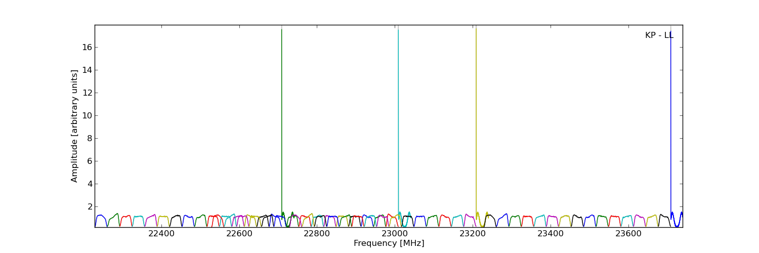 Total power spectrum in arbitrary units. The solid lines indicate the mean value and the shaded area the peaks.