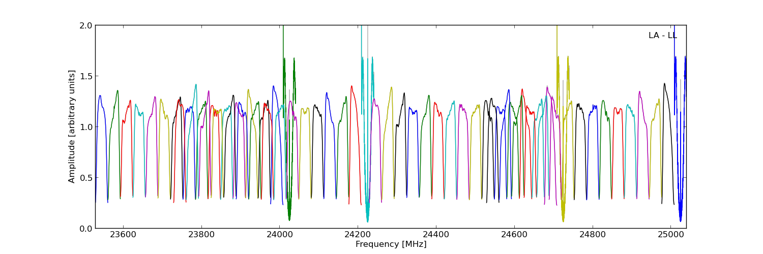Total power spectrum in arbitrary units. The solid lines indicate the mean value and the shaded area the peaks.