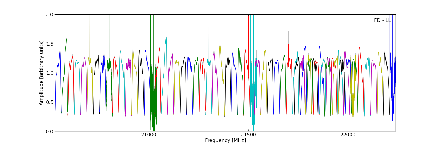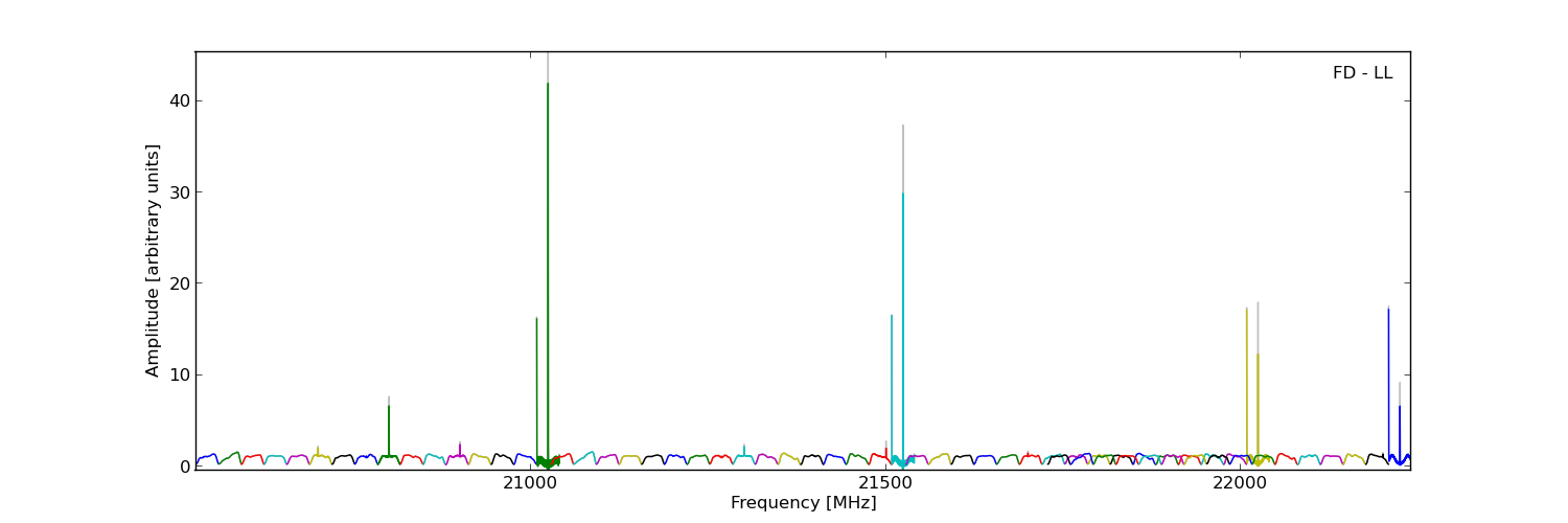 Total power spectrum in arbitrary units. The solid lines indicate the mean value and the shaded area the peaks.