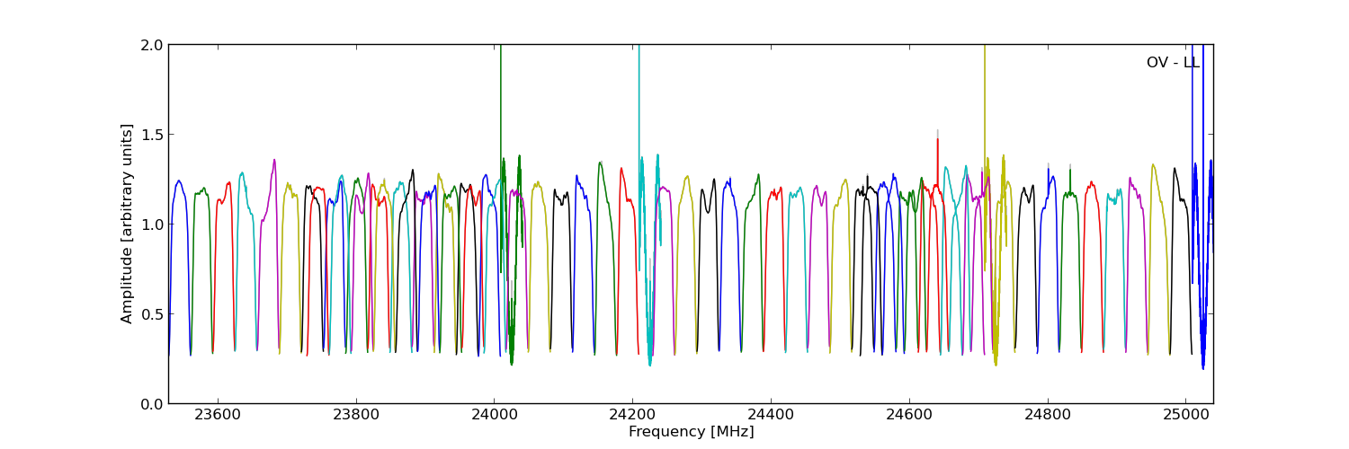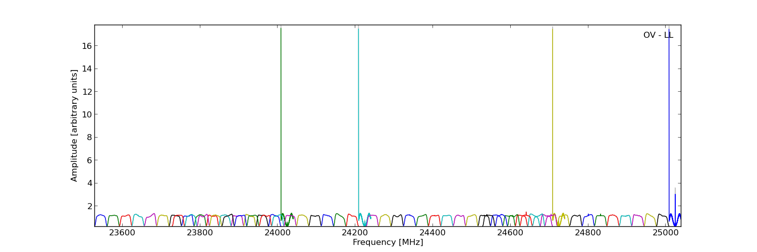Total power spectrum in arbitrary units. The solid lines indicate the mean value and the shaded area the peaks.