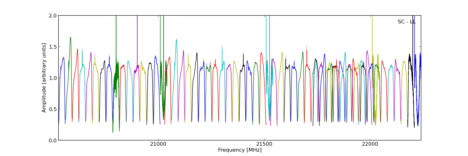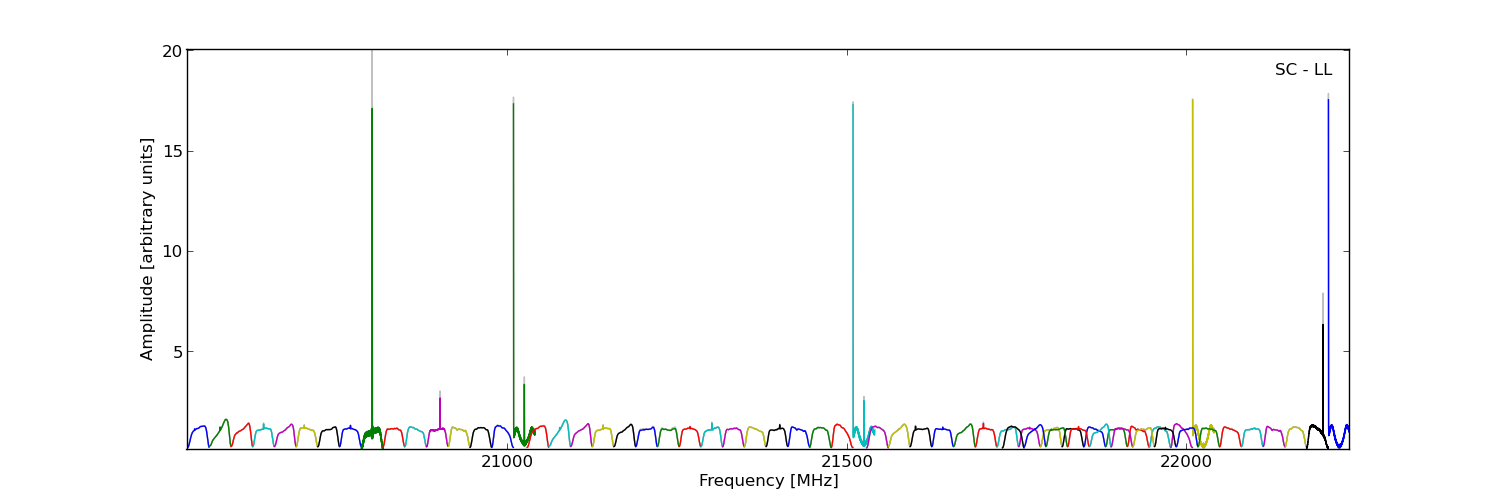 Total power spectrum in arbitrary units. The solid lines indicate the mean value and the shaded area the peaks.