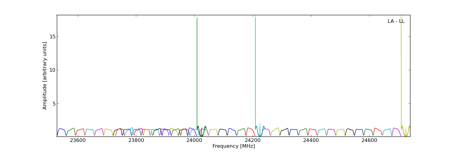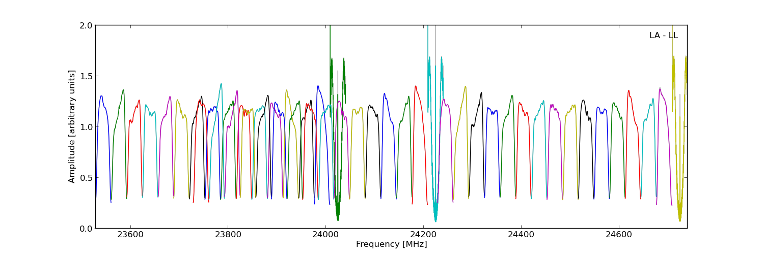 Total power spectrum in arbitrary units. The solid lines indicate the mean value and the shaded area the peaks.