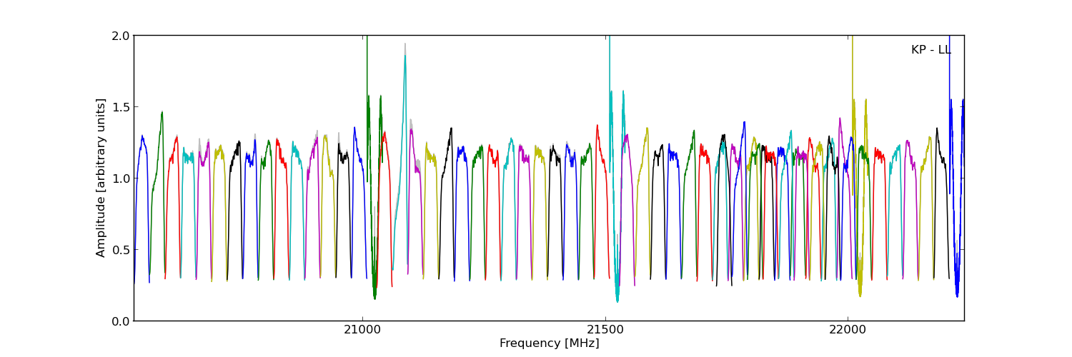 Total power spectrum in arbitrary units. The solid lines indicate the mean value and the shaded area the peaks.