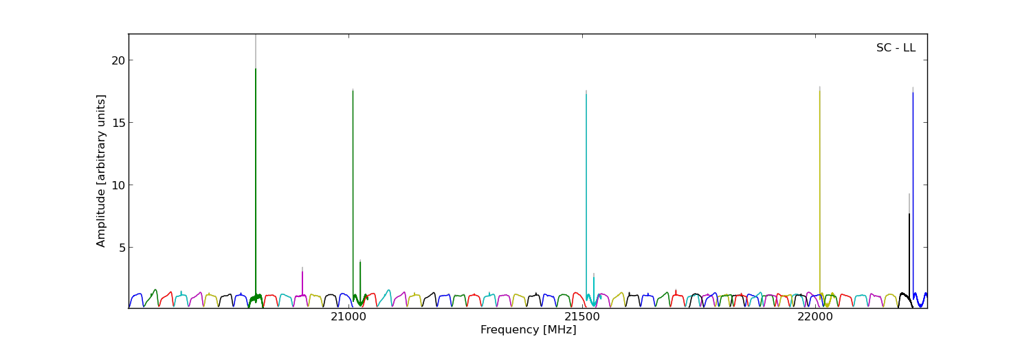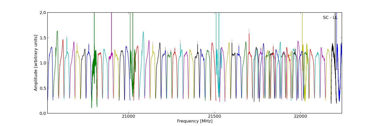 Total power spectrum in arbitrary units. The solid lines indicate the mean value and the shaded area the peaks.