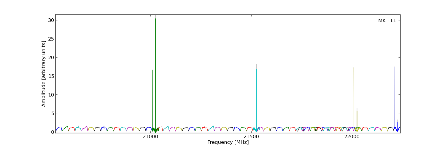 Total power spectrum in arbitrary units. The solid lines indicate the mean value and the shaded area the peaks.