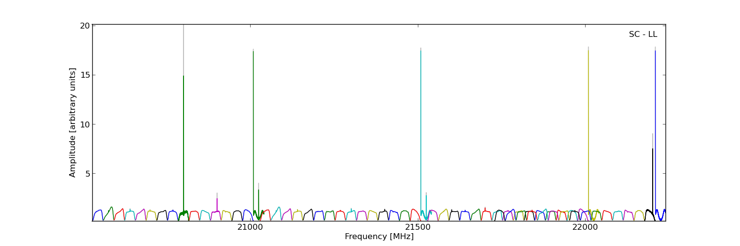 Total power spectrum in arbitrary units. The solid lines indicate the mean value and the shaded area the peaks.