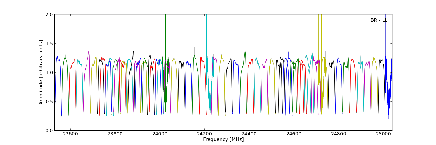 Total power spectrum in arbitrary units. The solid lines indicate the mean value and the shaded area the peaks.