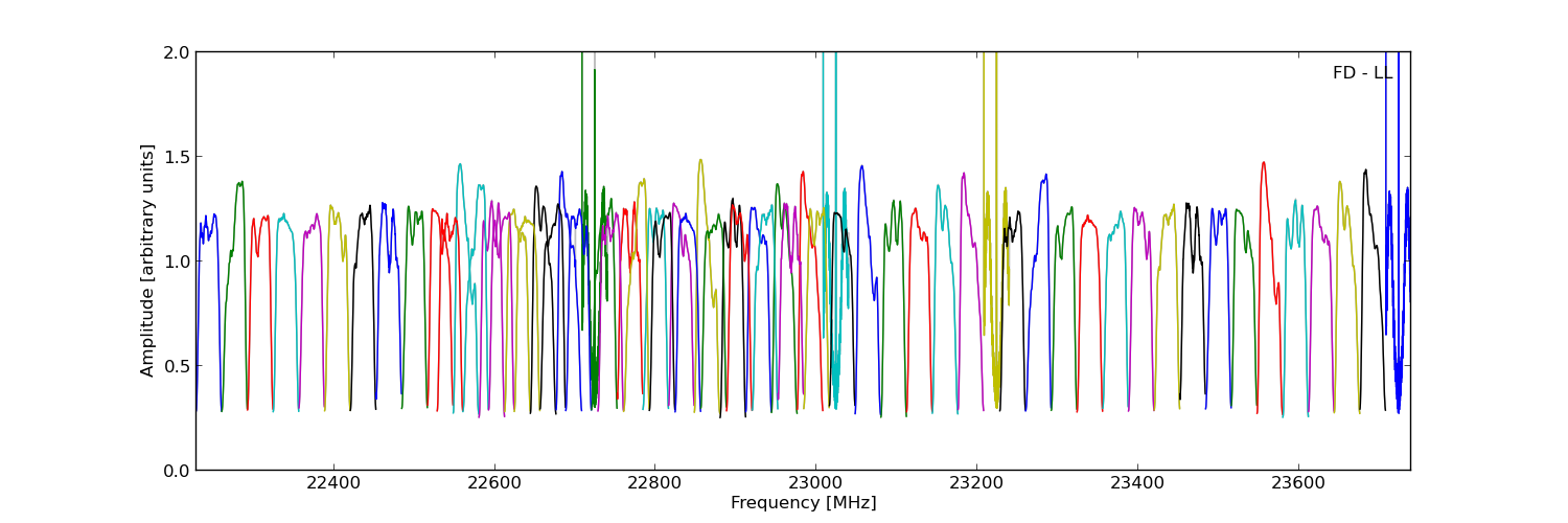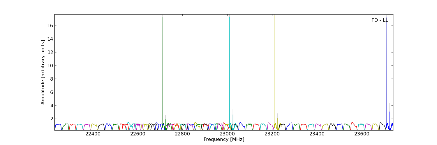 Total power spectrum in arbitrary units. The solid lines indicate the mean value and the shaded area the peaks.
