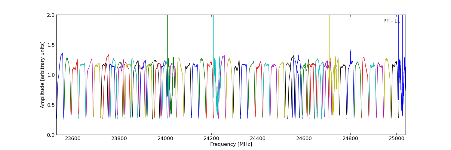 Total power spectrum in arbitrary units. The solid lines indicate the mean value and the shaded area the peaks.