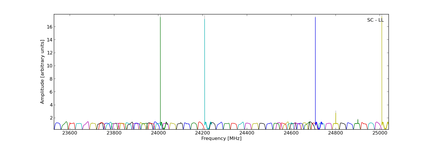 Total power spectrum in arbitrary units. The solid lines indicate the mean value and the shaded area the peaks.
