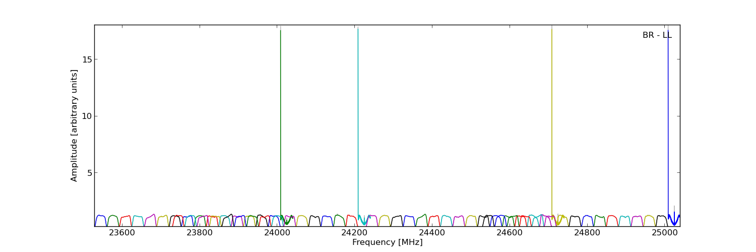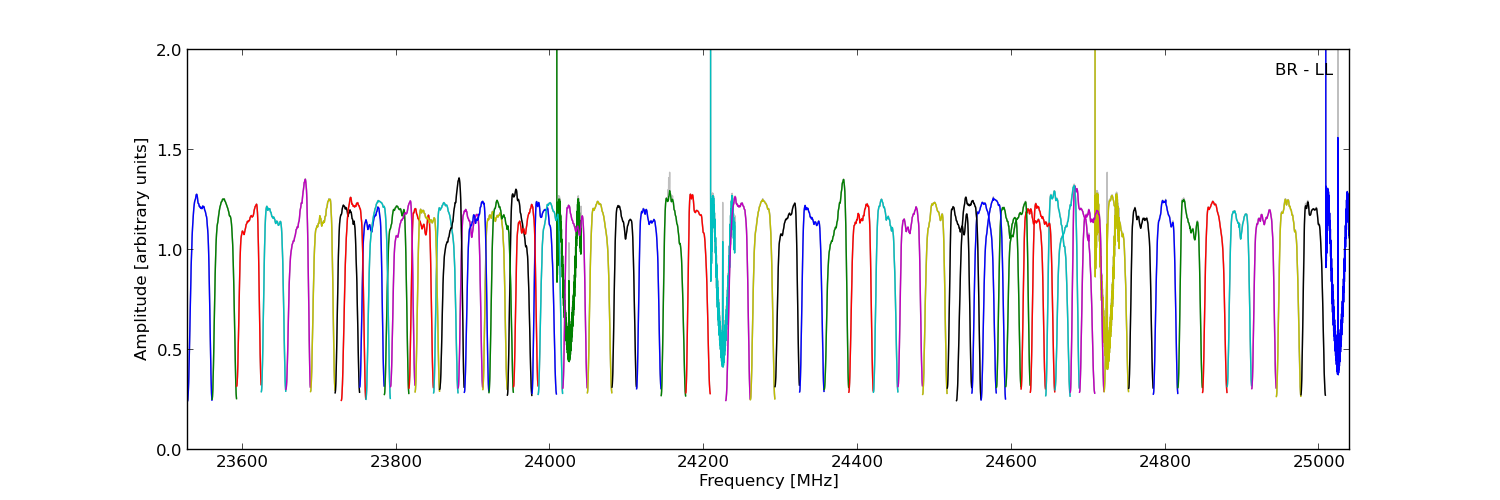 Total power spectrum in arbitrary units. The solid lines indicate the mean value and the shaded area the peaks.