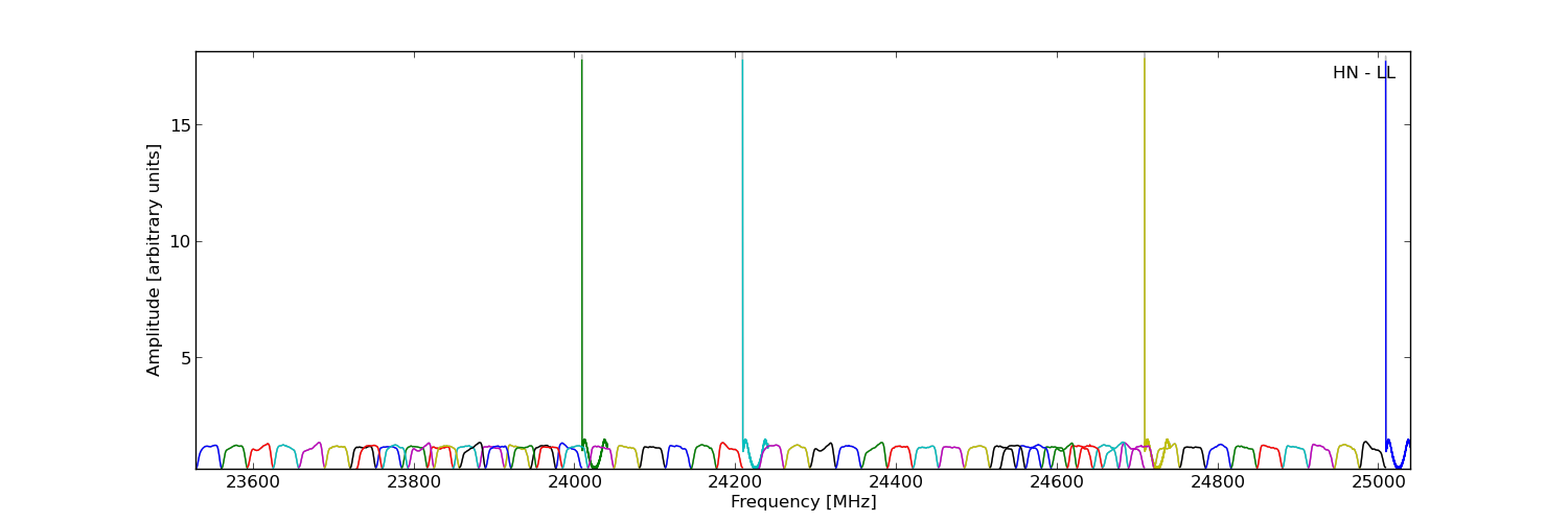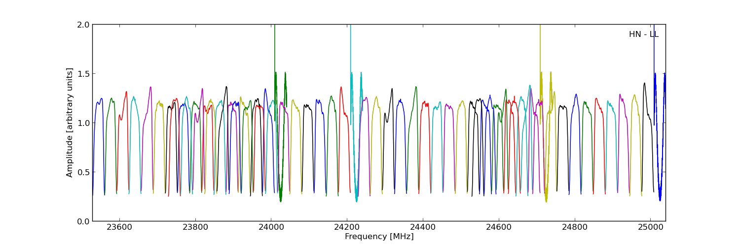Total power spectrum in arbitrary units. The solid lines indicate the mean value and the shaded area the peaks.
