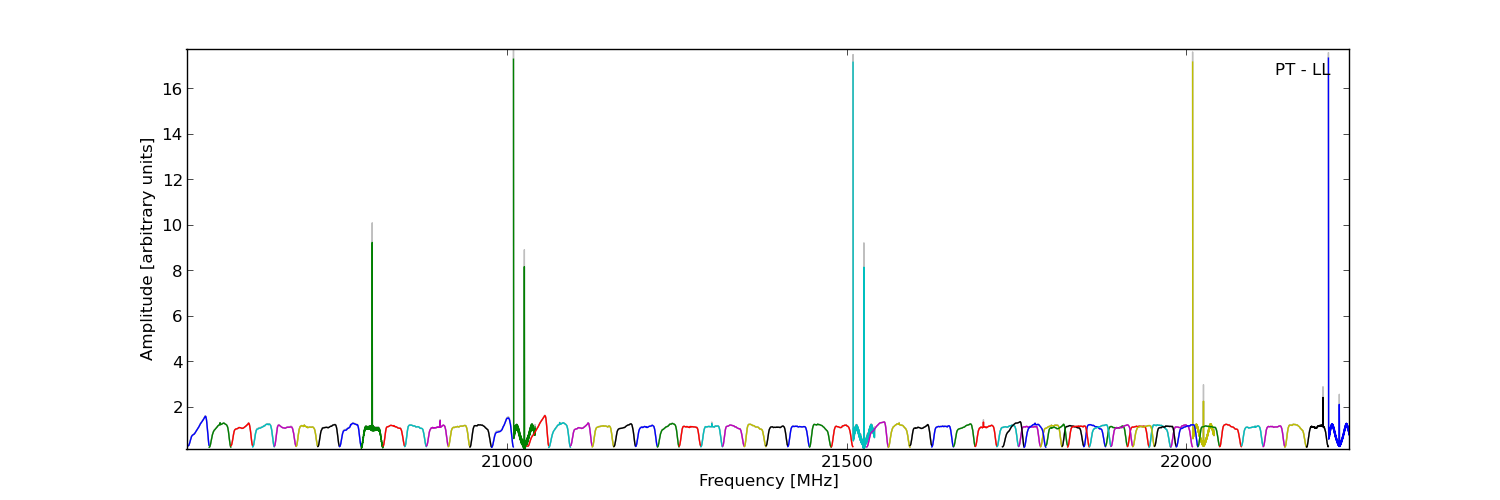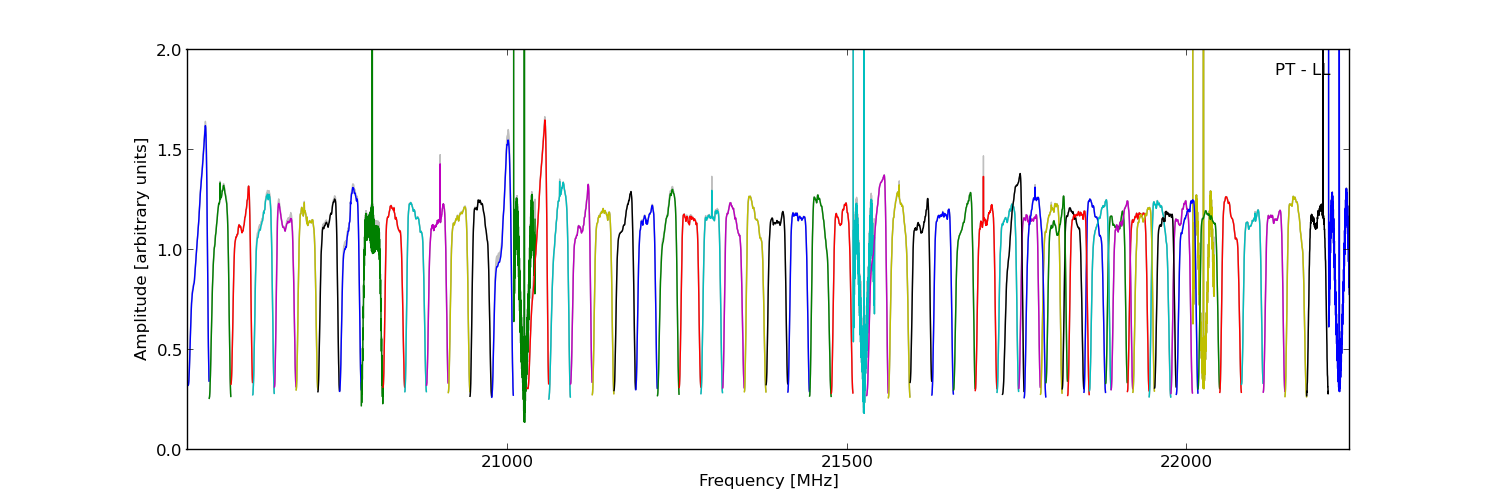 Total power spectrum in arbitrary units. The solid lines indicate the mean value and the shaded area the peaks.
