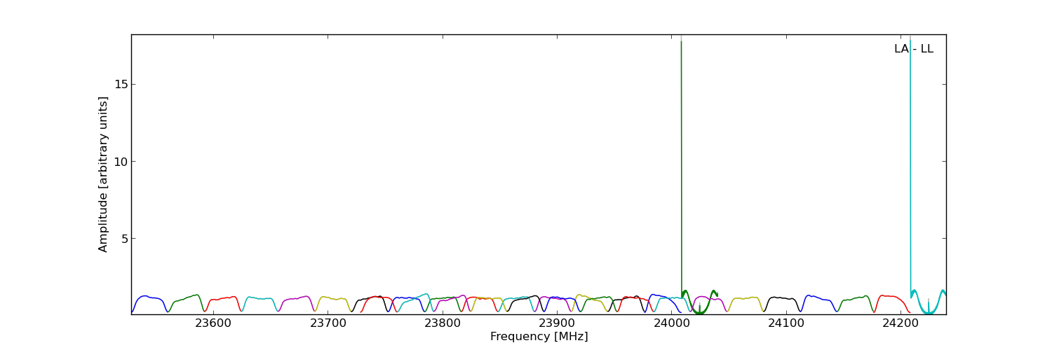 Total power spectrum in arbitrary units. The solid lines indicate the mean value and the shaded area the peaks.