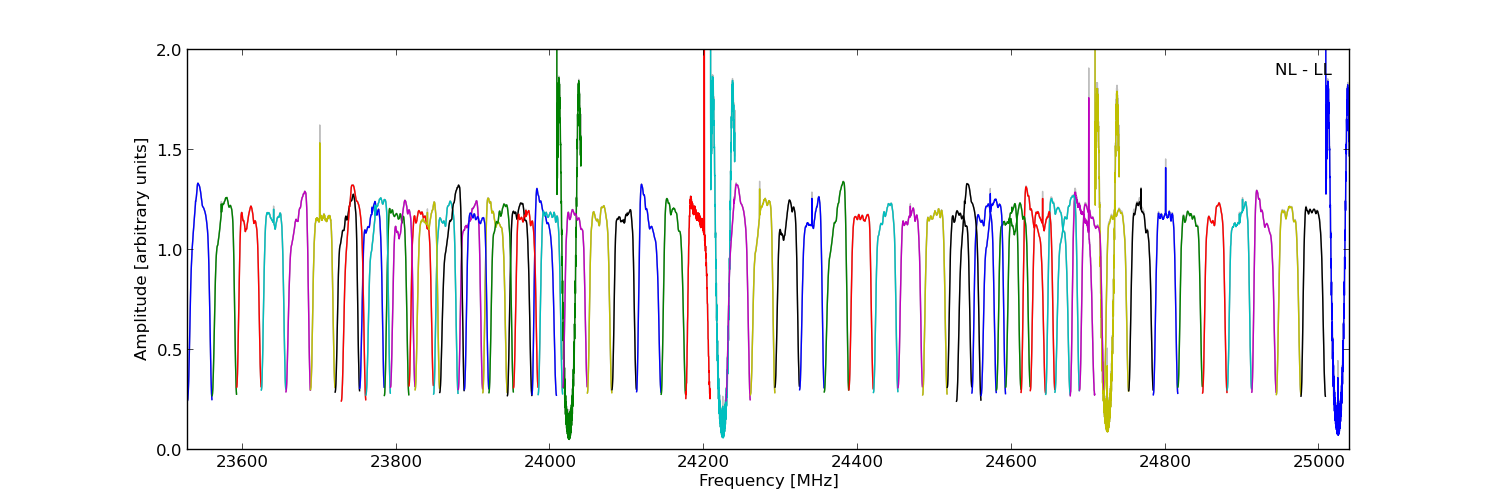 Total power spectrum in arbitrary units. The solid lines indicate the mean value and the shaded area the peaks.