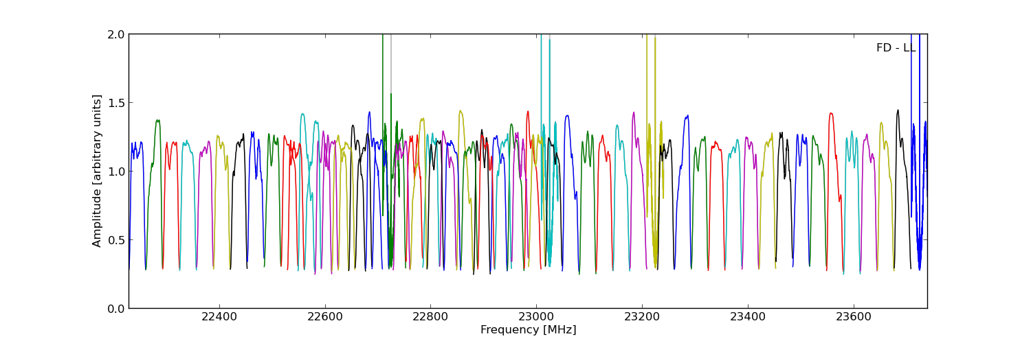 Total power spectrum in arbitrary units. The solid lines indicate the mean value and the shaded area the peaks.