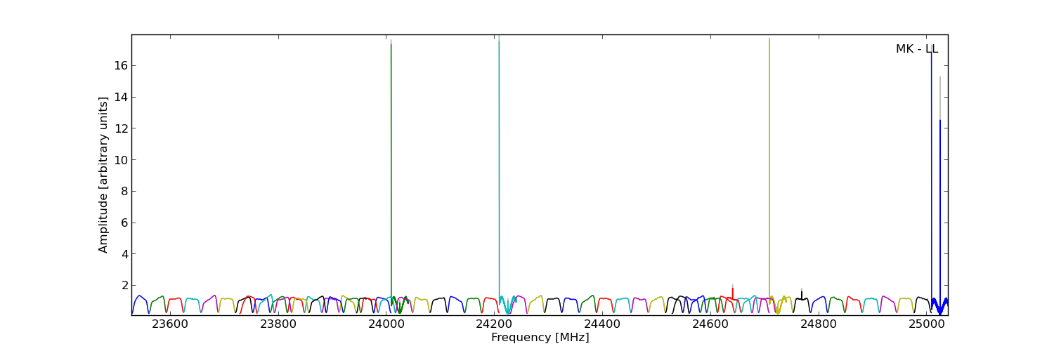 Total power spectrum in arbitrary units. The solid lines indicate the mean value and the shaded area the peaks.